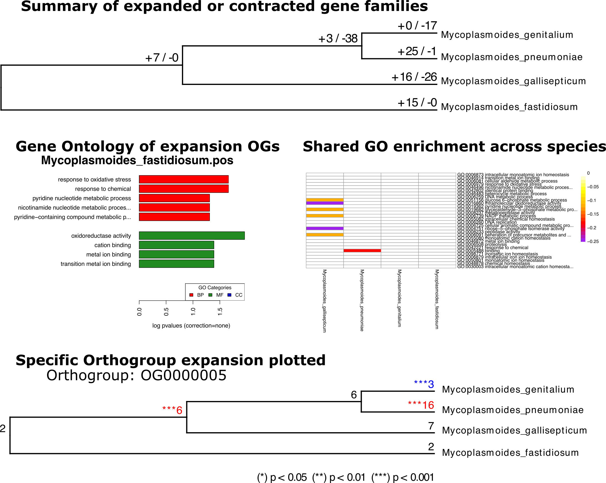 Top: A phylogenetic tree of mycoplasma input, with the number of significant expansion or contraction orthogroups. Left: Example Gene Onyology enrichment analysis showing terms significantly expansed in this species. Right: A heatmap of shared significant GO terms across all species (and nodes- when significant) Bottom: A phylogenetic tree tracing the number of gene copies of a single Orthogroup. Red = sig expansion, Blue sig contraction.